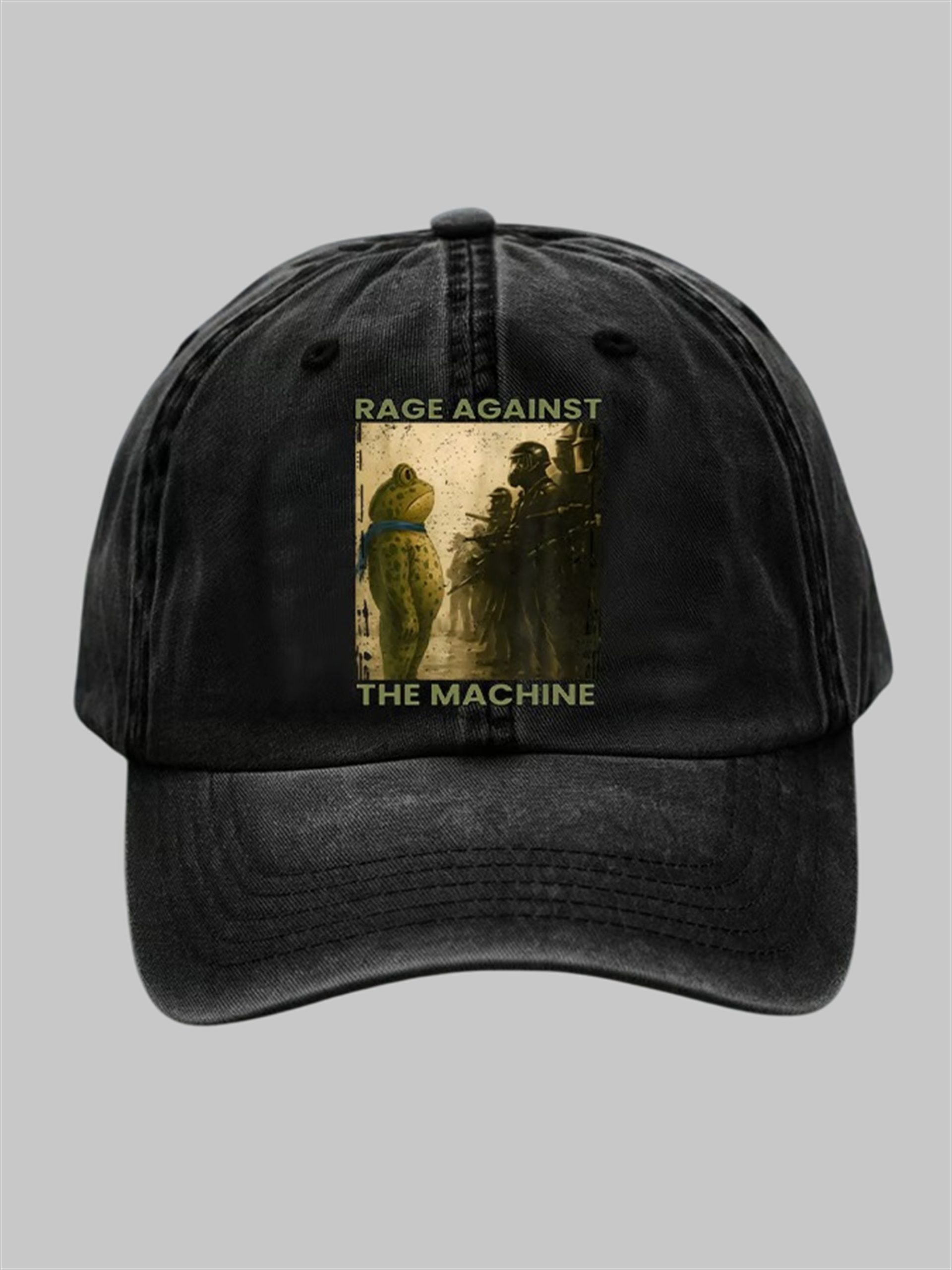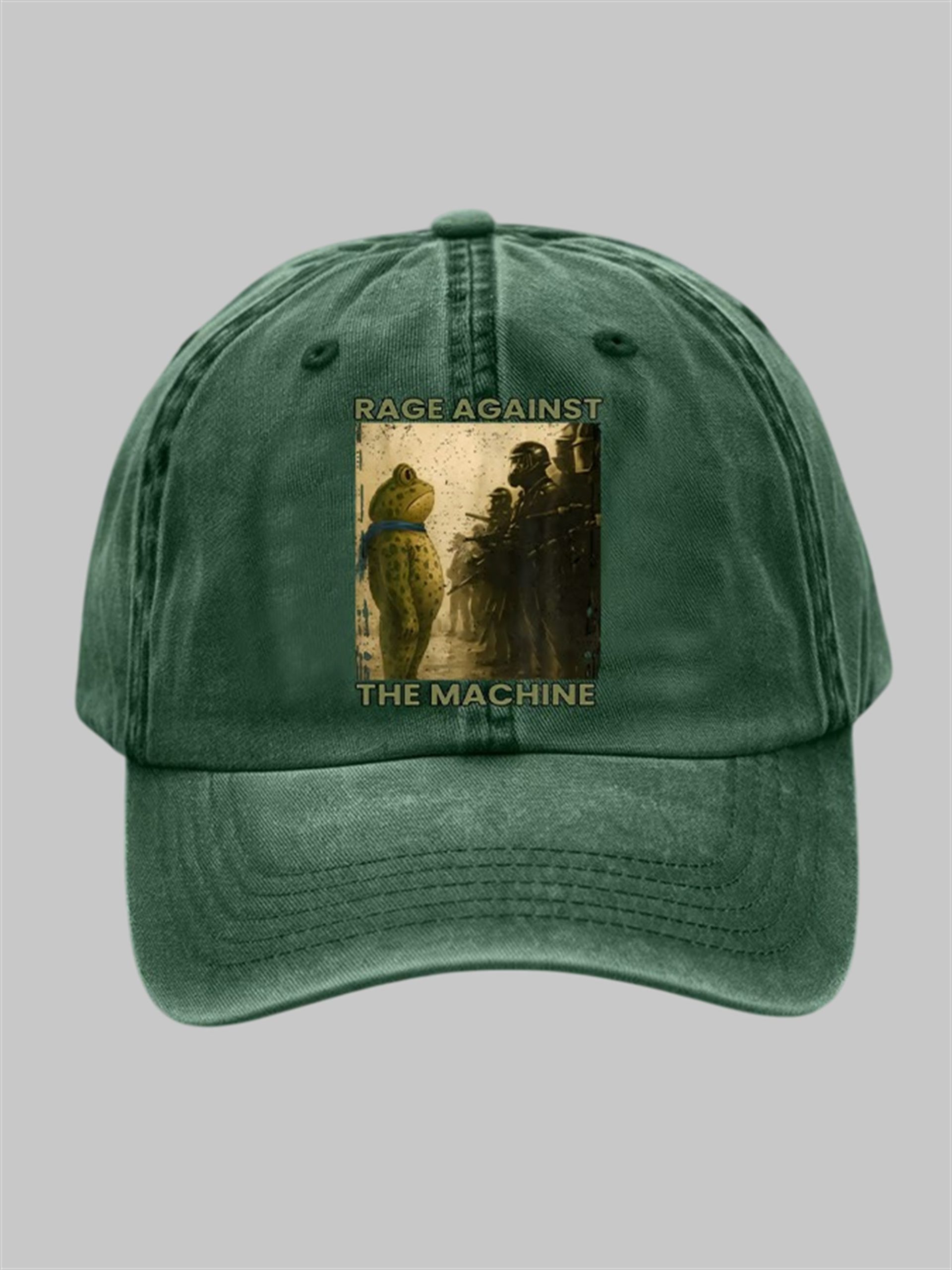 This hat takes the iconic, stark Evil Empire album cover—a symbol of anti-establishment defiance—and remixes it with a touch of amphibious absurdity. Where the stylized, shadowy figure once stood, a stoic frog now takes its place, ready to rage against its own machine (perhaps a machine that drains wetlands). It’s a design that’s both hilarious and pointed, a perfect “if you know, you know” nod to a very specific, and very cool, cultural intersection.