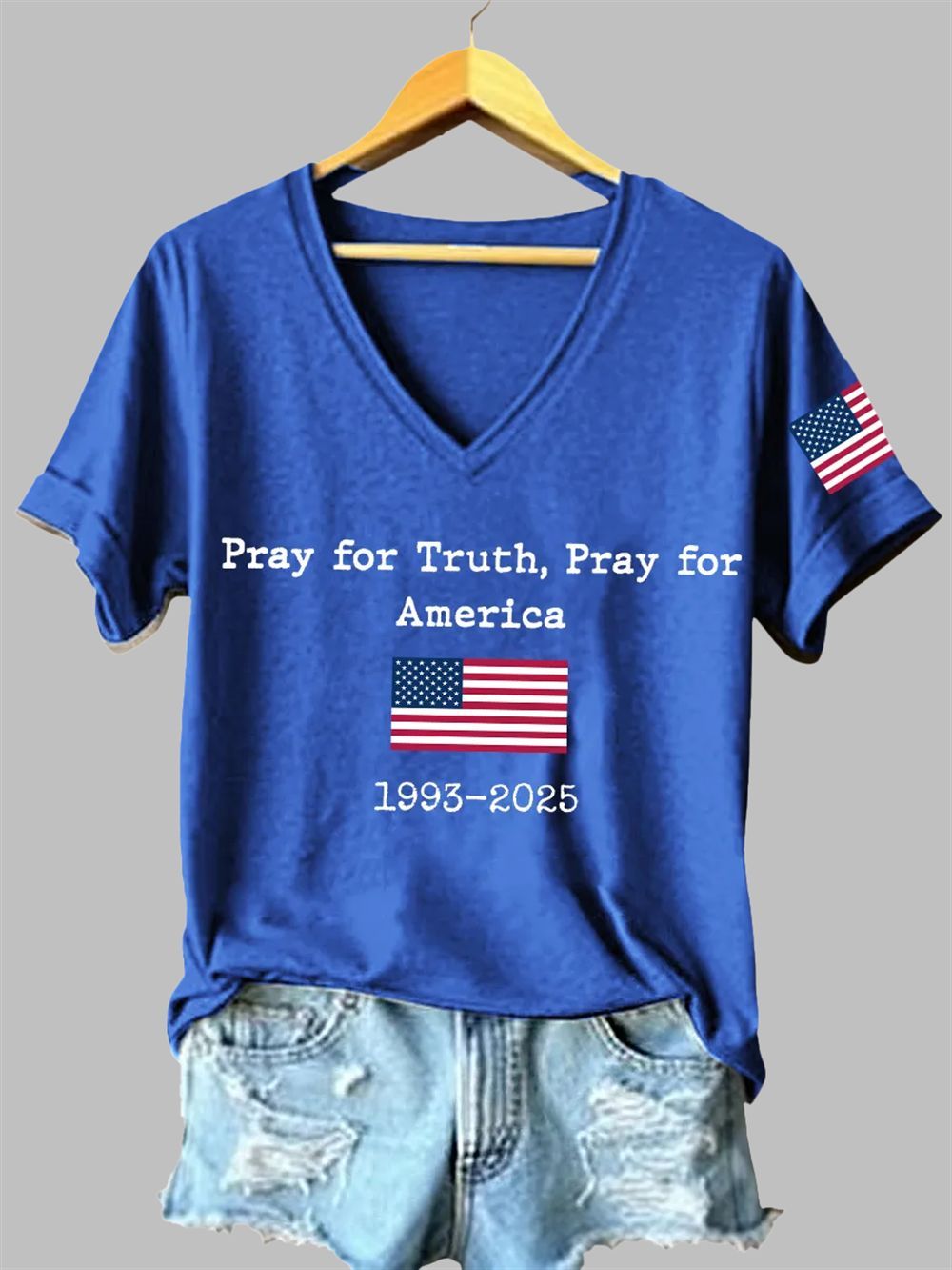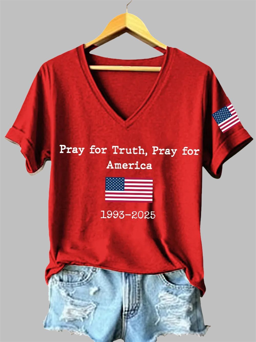Women’s Pray For Truth Pray For America Charlie Kirk Print V-Neck T-Shirt | A Tribute to a Conservative Icon