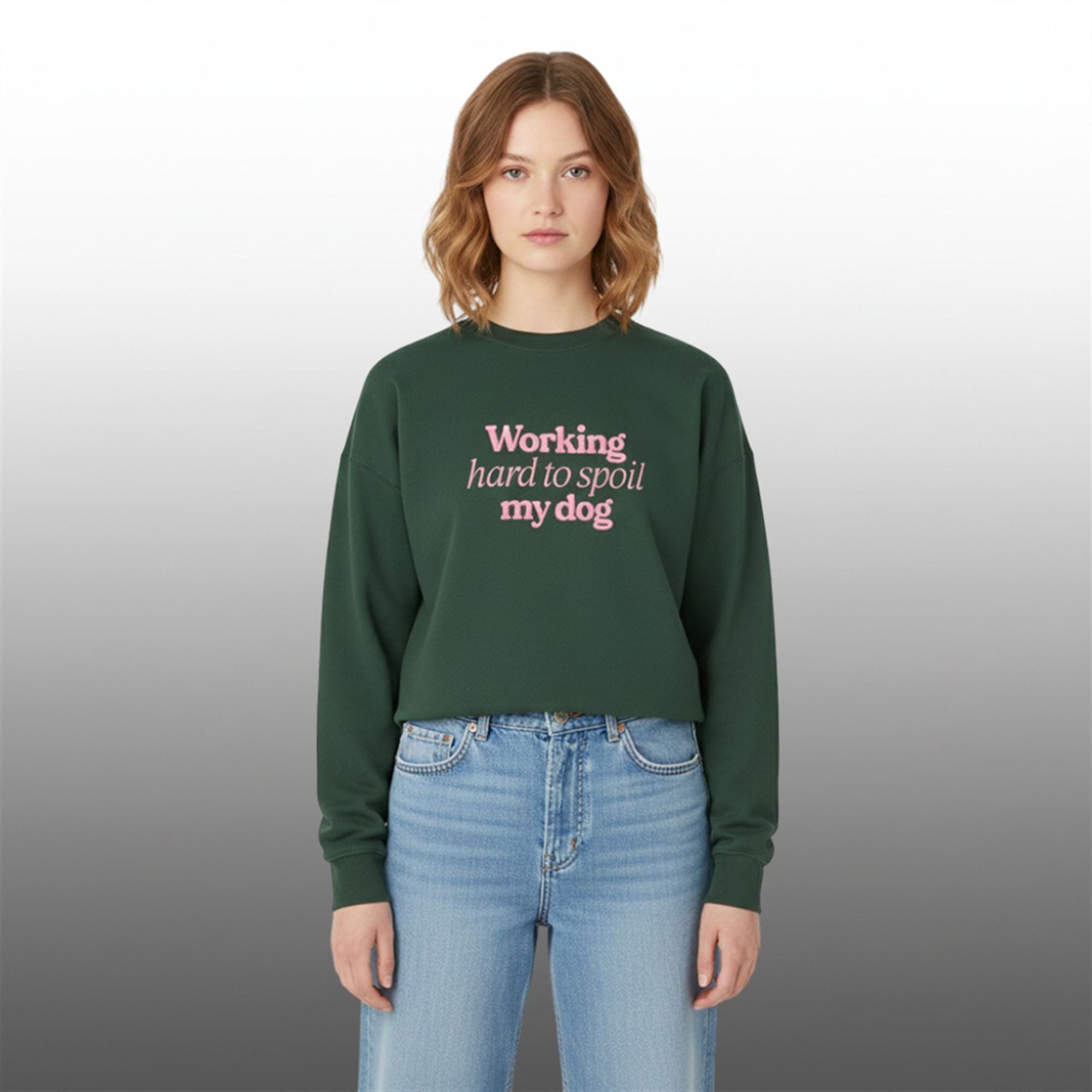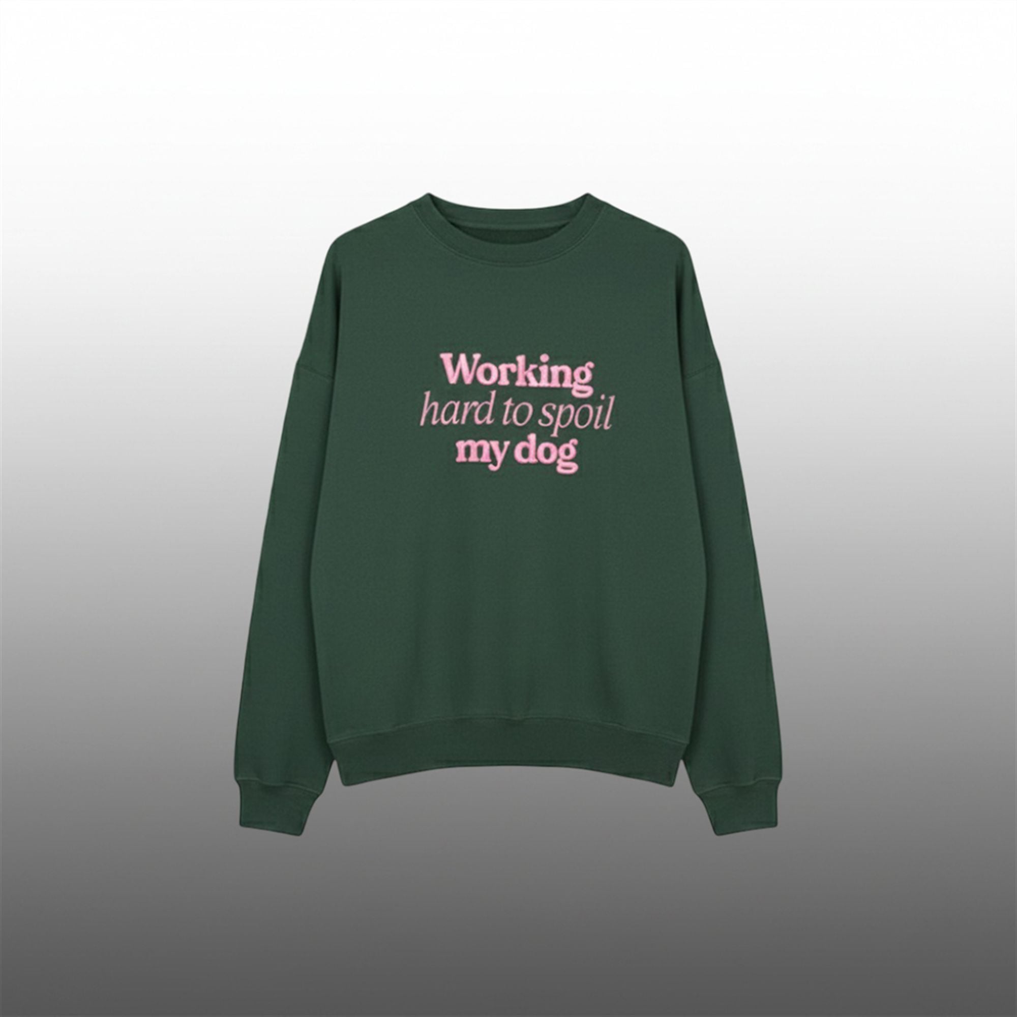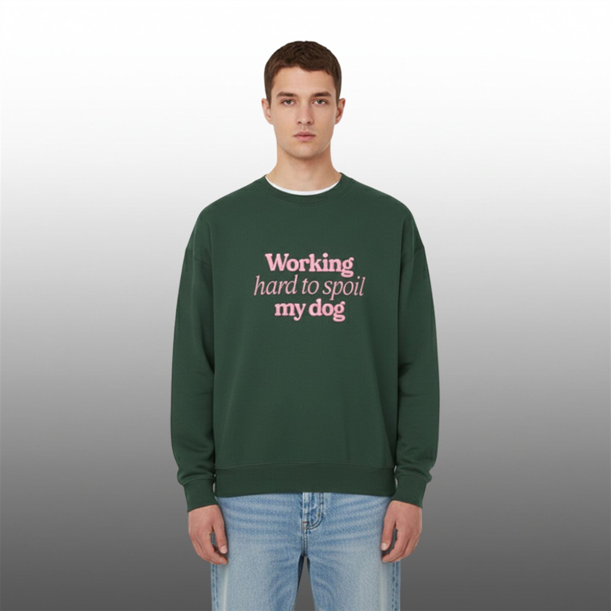 In the hustle of modern life, it helps to remember why we grind. For many of us, that “why” has four paws, a wet nose, and an expensive taste in treats. This sweatshirt features the hilarious yet heartwarming phrase, “Working Hard to Spoil My Dog,” printed in a stylish, retro-inspired serif font. The text is rendered in a delightful millennial pink that pops beautifully against the deep, rich forest green of the fabric.