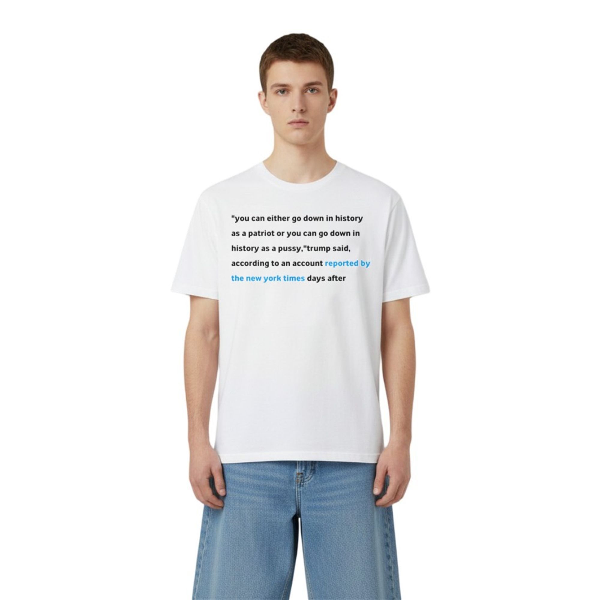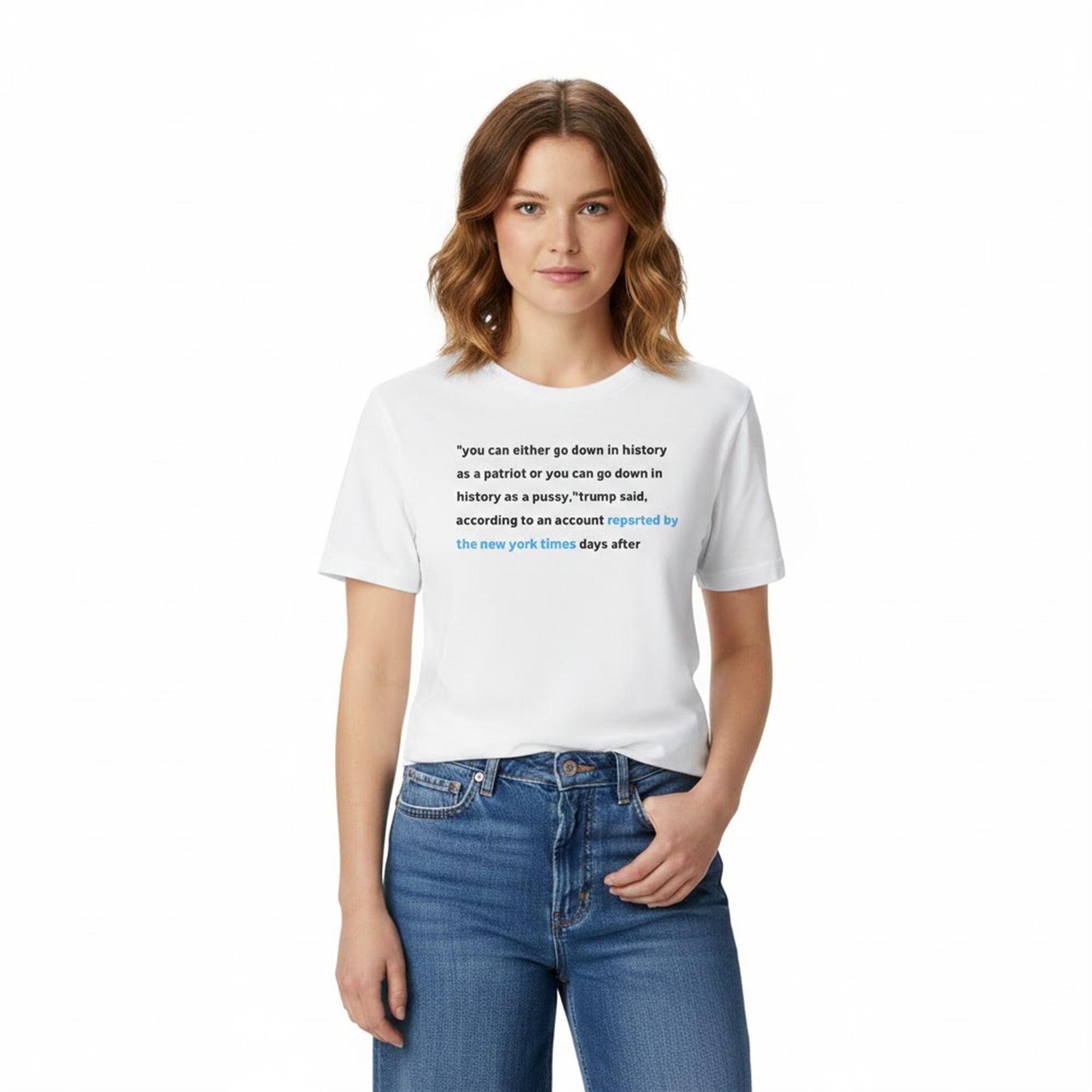 The shirt went viral because it juxtaposed the supreme authority of the Presidency with the vulgar, playground-bully language of a “p***y,” creating a cognitive dissonance that the public found impossible to ignore. It captured the exact moment when the high stakes of certifying an election collided with crude personal insults, perfectly encapsulating the chaos of the era. The specificity of citing The New York Times on the garment turned it into a meta-commentary on how we consume shocking news, transforming a fleeting report into a permanent symbol of political absurdity.