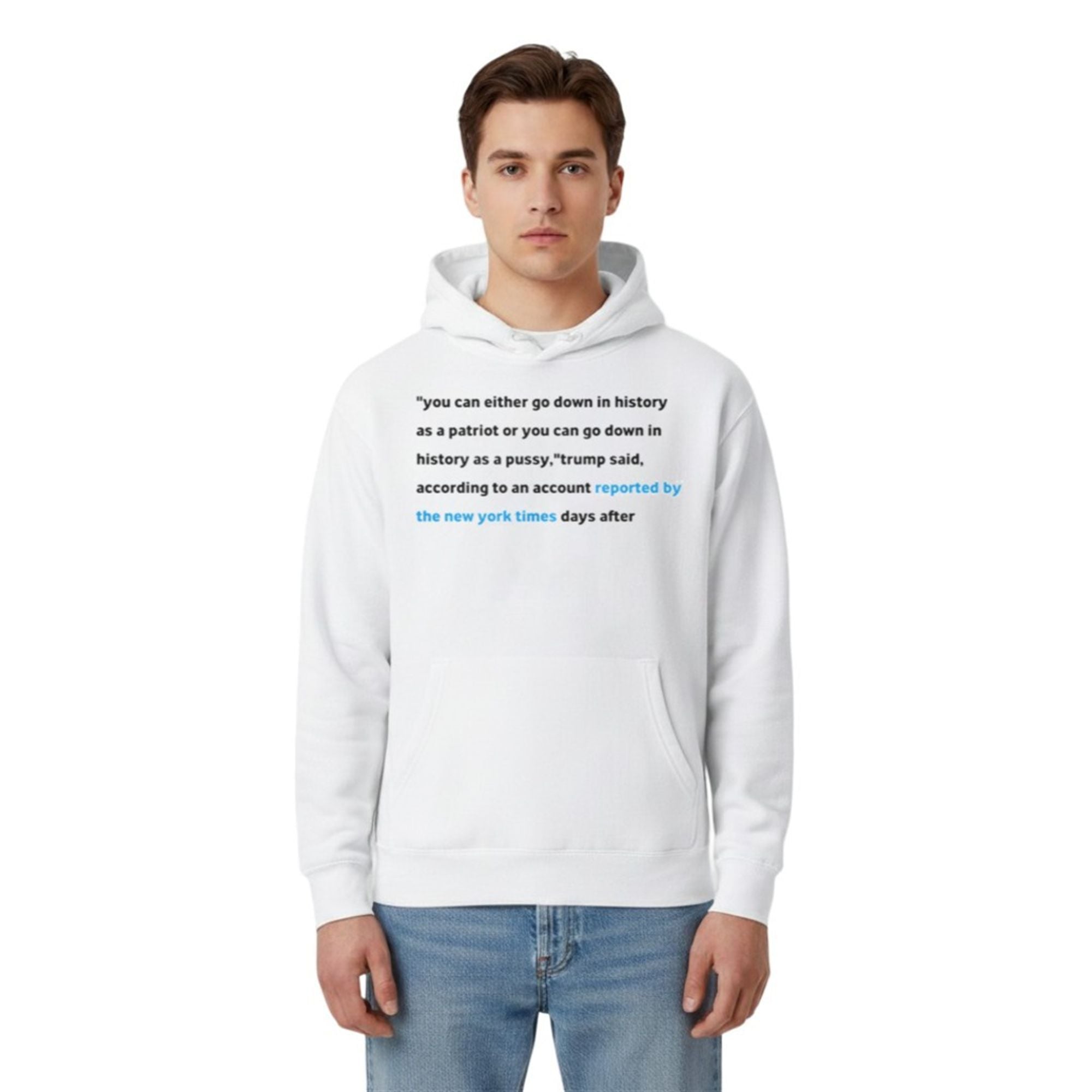 Crucially, the design highlights the source of the quote—”you can either go down in history as a patriot or you can go down in history as a pussy,” trump said, according to an account reported by the new york times days after“—in a distinct cyan blue. This color choice not only breaks up the monochrome text but also serves as a visual citation, grounding the shocking language in verified reporting. The layout is deliberately justified to resemble a clipping from a news feed or a viral screenshot, tapping into the “scroll-stopping” visual culture of the internet.