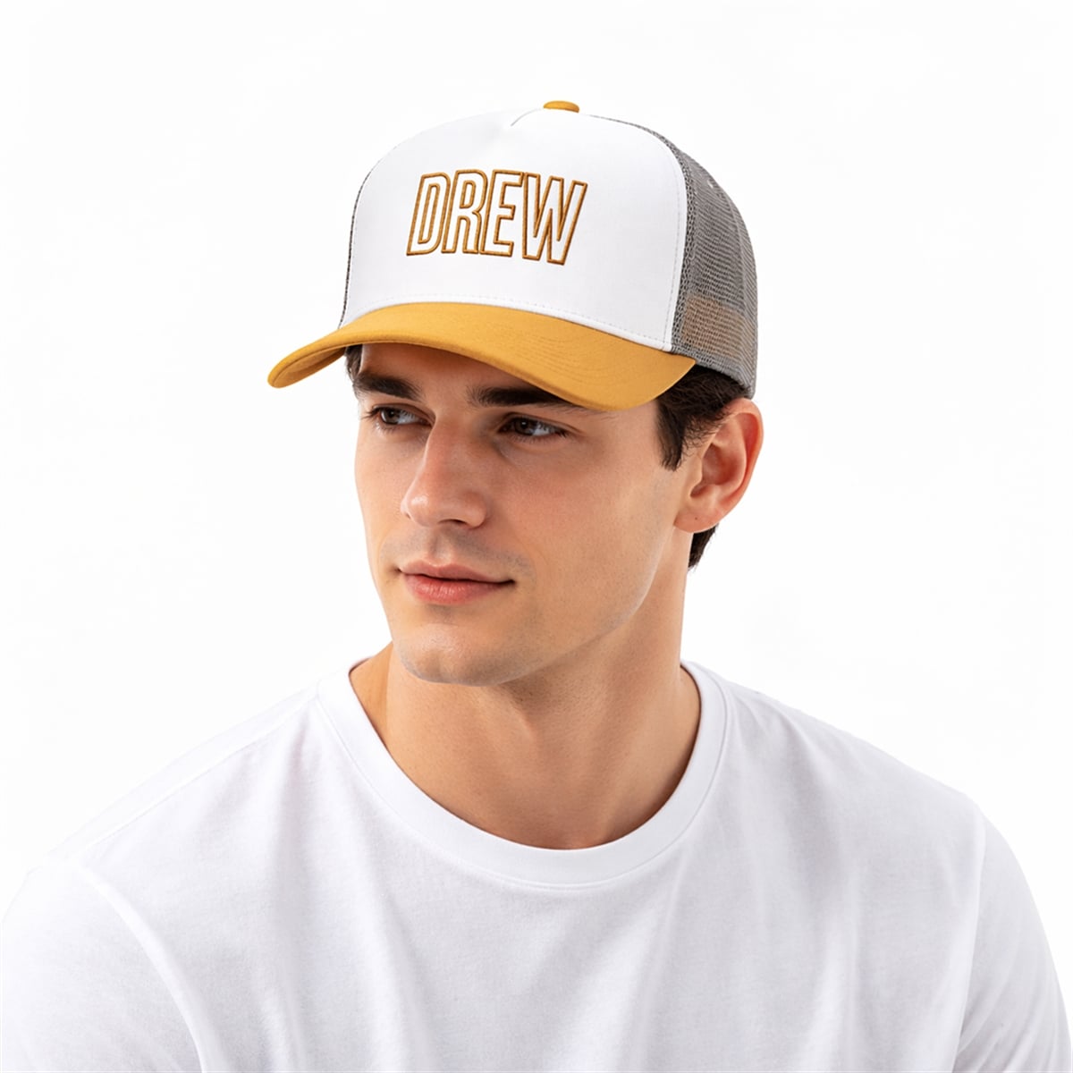 This iconic piece of headwear brings a striking visual contrast to any ensemble, featuring a crisp white front panel boldly displaying the word “DREW” in a distinct mustard-yellow font. The front design is perfectly complemented by a matching mustard-yellow bill and a contrasting grey back section, creating a balanced, earth-toned color palette. Originally thrust into the spotlight by the renowned pop icon Zayn Malik, this accessory bridges the gap between high-profile celebrity fashion and everyday streetwear. The two-tone aesthetic is carefully designed to stand out visually without overwhelming an outfit, making it an incredibly versatile addition to any modern wardrobe.